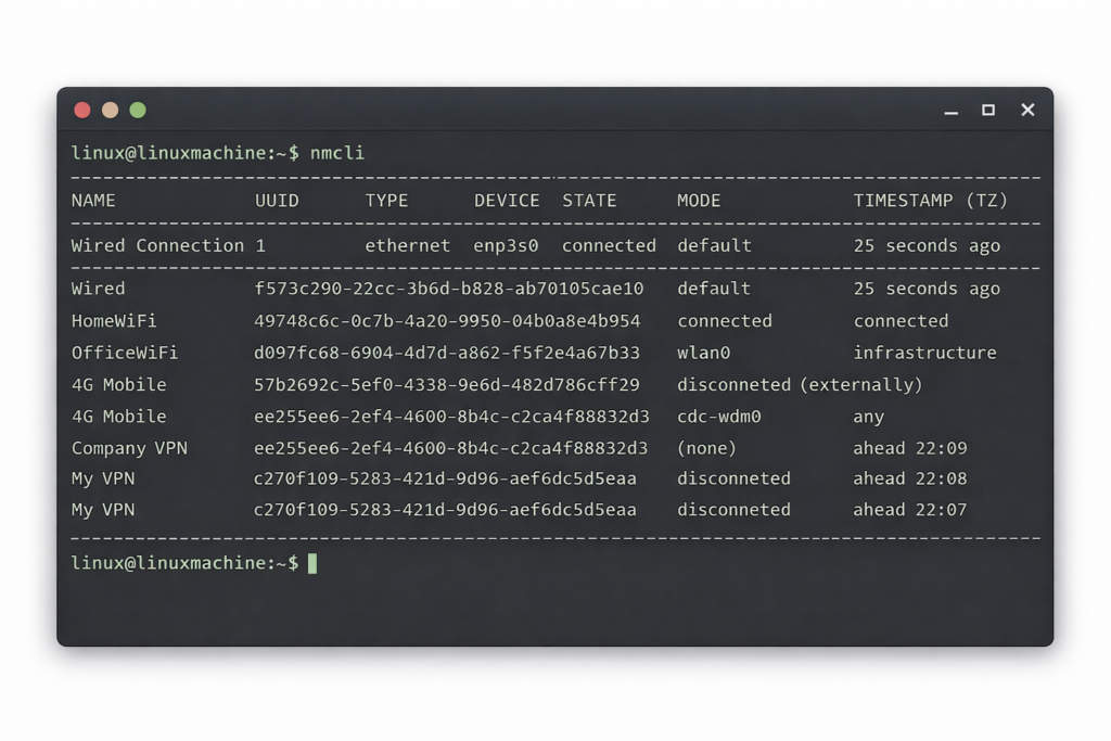 Launching a terminal and entering the command nmcli gives you access to the nmcli command line interface. This will bring up the nmcli prompt, at which point you can enter commands and observe the results of those commands.